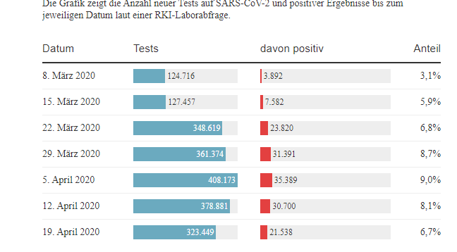 Idemásolom, hogy Németországban hány tesztet végeztek el március elejétől napjainkig hetente, és csak megemlíteném, hogy ez soha nem volt titkos, senki meg sem próbálta elhallgatni, vagy meghamisítani.