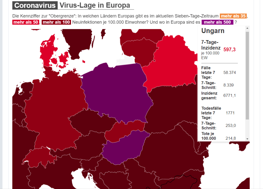 A mellékelt két térképből jól látszik, hogy hazánk Lengyelországgal kimagaslóan rossz statisztikát produkál, de a magyar adatok a lengyelekéit is felülmúlják. (Az adatok 100 ezer lakosra vetítve 7 nap adatait tartalmazzák összesítve) A kékeslila szín kizárólag a két legfertőzöttebb országot, hazánkat és Lengyelországot jelöli. A piros 597,3-as szám a 100 ezer lakosra jutó új fertőzött számát mutatja 7 nap összegében Magyarországon.