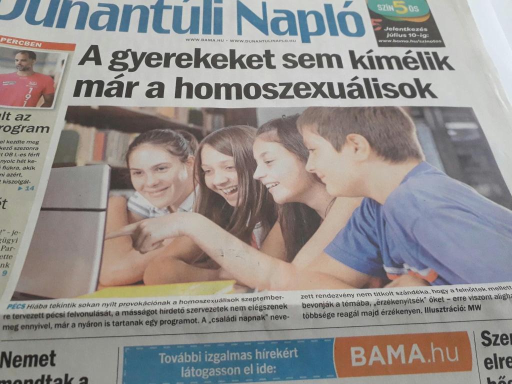 A legjobb bizonyítékot erre a Dunántúli Naplónak sikerült szállítania, amikor a képen látható címlappal jelent meg, vagyis megfejtette kormánya és kenyéradója nem is annyira rejtett üzenetét, belevágott a lecsóba, látványosan cáfolva ezzel a hatalom és Orbán minden magyarázkodását arról, hogy itt szó sincs a melegek elleni támadásról, csak és kizárólag a gyerekeink védelme lebeg a fényes tekin-tetűk szeme előtt.