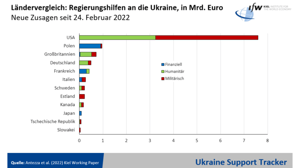 Az első táblázatban az Ukrajnának megítélt kormányzati támogatások láthatóak milliárd euróban. A zöld szín a humanitárius, a kék az anyagi, a piros a fegyverszállítási támogatást mutatja 2022. február 24-től napjainkig.