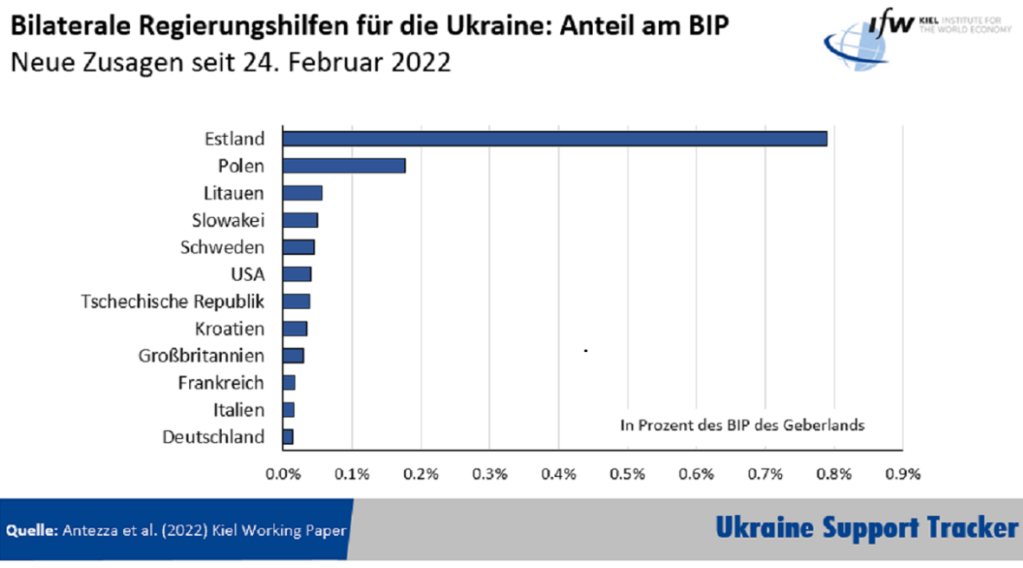 A második táblázat a kétoldalú kormányzati támogatások nagyságát ábrázolja az adott ország GDP-je arányában. Az első három helyen Észtország, Lengyelország és Litvánia áll, Szlovákia és Svédország előtt. A három első aktivitása földrajzilag és történelmileg teljesen érthető. Szlovákia és Svédország áldozatvállalása sokatmondó.