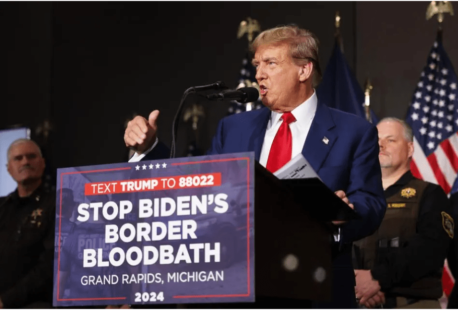 Trump választási riválisa, Joe Biden megengedő migrációs politikáját ostorozva azzal heccelte hallgatóságát, hogy hamarosan „vérfürdők” lesznek az országban, amiért a demokrata adminisztrációt terheli a felelősség, mert „őrültek házából szabadultakat, börtönökből szökött bűnözőket enged be az országa, akik ártatlan amerikaiakat támadnak és gyilkolnak meg. Ezek nem emberek, ezek állatok” – fröcskölt Trump.