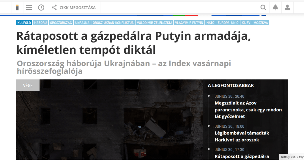 Magyarország leglátogatottabb, álcázottan kormánypárti portálja, az index.hu teljesen megszabadult a jó ízlés és a legalapvetőbb erkölcsi normák megkötéseitől. A mindkét oldalon, tehát a támadó orosz hadseregnél és a hazáját védő ukránoknál is százezres nagyságrendben életeket, köztük ukrán oldalon civilek, gyerekek életét követelő orosz-ukrán háborúval kapcsolatban képes volt egy cikkét a következő címmel közreadni: “Rátaposott a gázpedálra Putyin armadája, kíméletlen tempót diktál.”