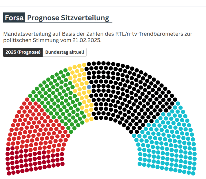 The new election law has reduced the number of Bundestag representatives from 736 to 630. According to the Forsa Institute, the distribution of seats is expected to be as follows: CDU/CSU 200, AfD 145, SPD 104, Greens 90, Left Party 55, FDP 35. The most likely coalition is CDU/CSU-SPD-Greens. Mathematically, a CDU/CSU-SPD-Left Party-FDP coalition is also possible but unlikely. No party is willing to enter into a coalition with the AfD.
