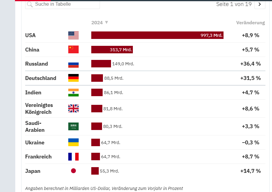 Az ukrajnai és gázai háborúk súlyos következményekkel járnak: a katonai kiadások olyan mértékben növekednek, amilyenre a hidegháború vége óta nem volt példa. Németország először került a világon a negyedik helyre az Egyesült Államok, Kína és Oroszország után. A világ katonai kiadásai 2024-ben már tíz egymást követő évben nőttek. Különösen Európában és a Közel-Keleten volt erőteljes az emelkedés, amit az ukrajnai és a Gázai övezeti háborúk, valamint az Izrael és a libanoni Hezbollah közötti konfliktus magyarázhat.